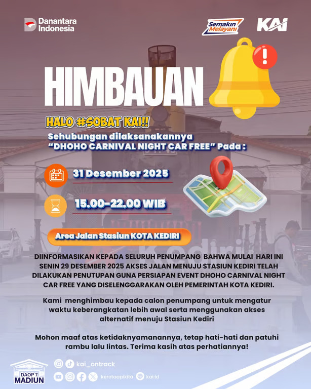 JAKARTA, CILACAP.INFO – PT Kereta Api Indonesia (Persero) Daerah Operasi 7 Madiun mengimbau para pelanggan kereta api yang akan berangkat dari Stasiun Kediri pada Rabu malam, 31 Desember 2025, untuk datang lebih awal ke stasiun, minimal 1 (satu) jam sebelum jadwal keberangkatan kereta api.